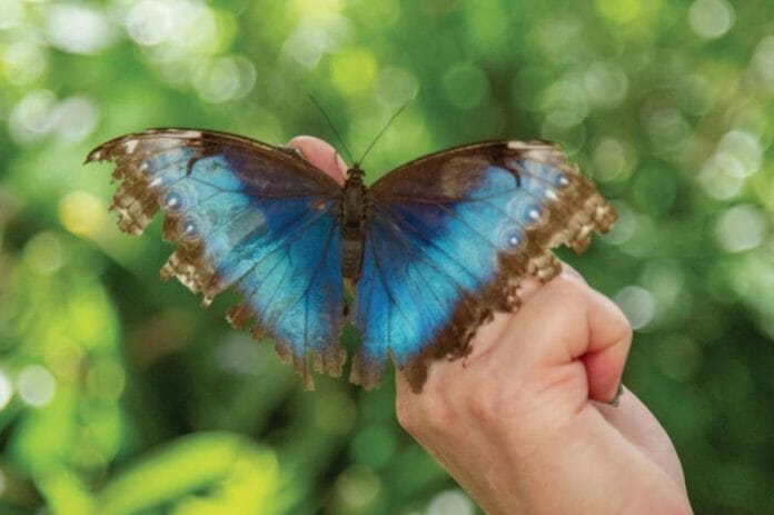 An easy trip up I-15 to Thanksgiving Point’s Butterfly Biosphere will take you to the 85 degree humid and lush green environment of tropical flowering plants and butterflies, more than 1,000 butterflies. The biosphere also has 20 species of tarantulas and a few other (harmless) crawly creatures. You quickly forget the ice and snow you came from The Thanksgiving Point Butterfly Biosphere opened a year ago, Jan. 18, with a 40,000 square foot facility that includes a 10,000 square foot temperature and humidity-con- trolled greenhouse that is a USDA approved containment facility, because none of the butterflies are native to Utah.