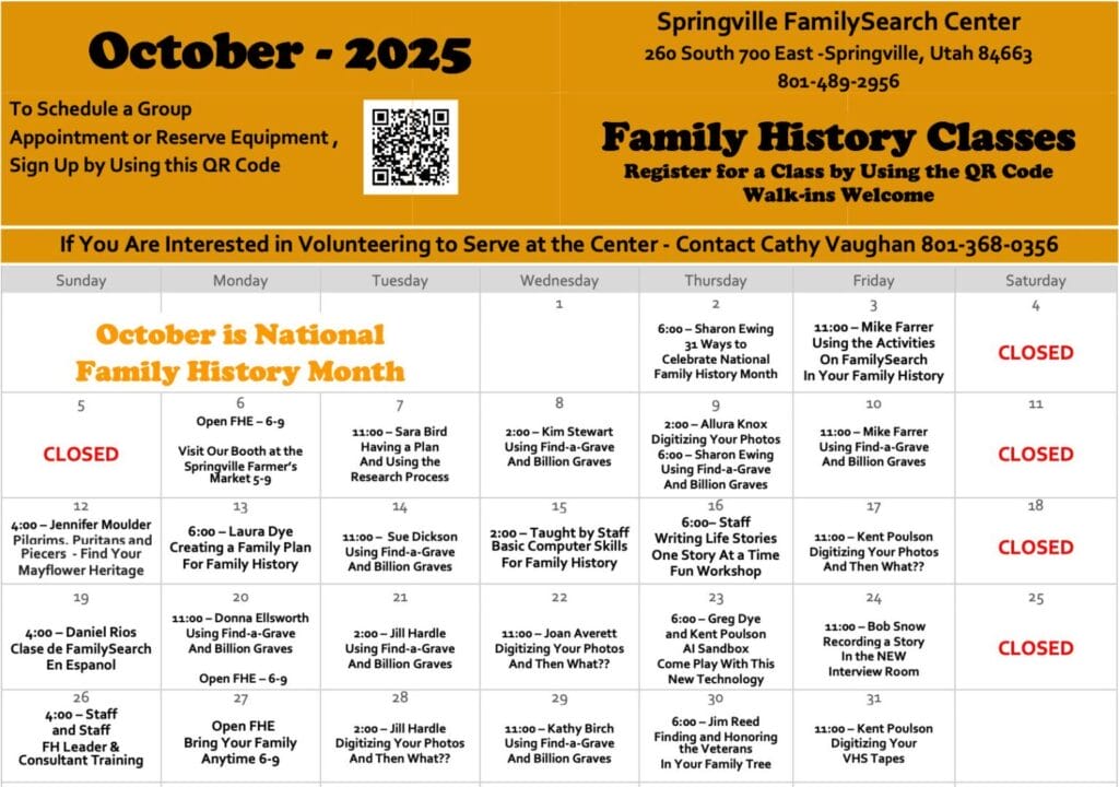 The Springville FamilySearch Center at 260 S. 700 E. is promoting Family History Month in a big way by providing classes almost every day during the month. Qualified instructors will teach about finding your Mayflower ancestors and ways to honor the veterans in your family. There will be classes on digitizing photos and VHS tapes and using the new Interview Room to record personal and family stories for posterity. You can also learn more about the great resources available on Find-a-Grave and Billion Graves. If you don’t know where to start, there are classes on creating a plan and using the research process. One of the most exciting classes will focus on creating a family plan to make family history part of your lives year-round. Training is also available for anyone who has church callings in Temple and Family History.
