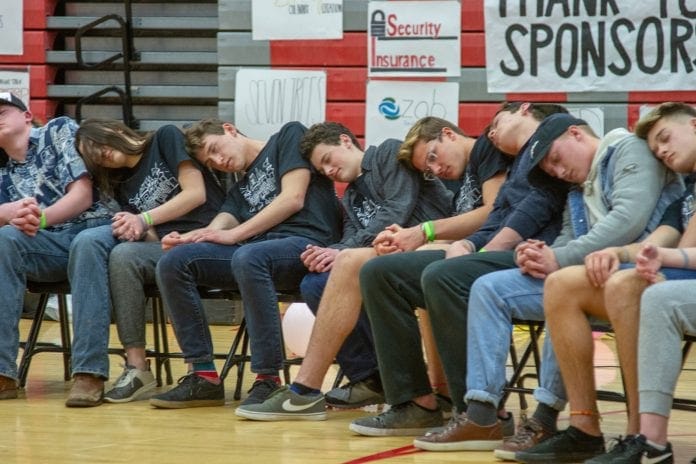 By seven o’clock the bleachers were full, and people were beginning to sit on the floor awaiting comedy hypnotist Hypno Hick, otherwise known as Shaun D. Christensen. He had 24 chairs arranged in an arc and asked for volunteers. For an hour and a half, he entertained the crowd by asking the hypnotized students to do various acts such as fall asleep, drive a fast car, lay on the floor and dance. It was clean and hilarious comedy and the crowd wanted more. After almost two hours the program came to an end with a brief discussion on how to always feel confident in yourself. The gym floor was cleared, the bleachers retracted, the music began, and the lights went low. The students were having a great time and lot of calories were burned in the next four hours.