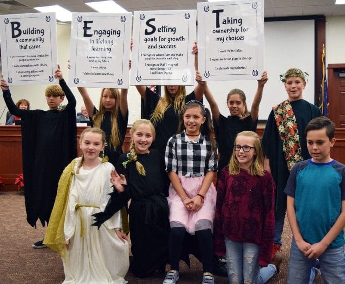 For the main presentation, the sixth-grade student council members performed a creative skit for the Board. The “Ghost of Brockbank Past” reviewed the history of the school with an overview of its opening in 1959, its 5 principals, and the general size of the school at the time. The students sang and danced to “Rockin’ Around the Christmas Tree” to commemorate the era and the season.