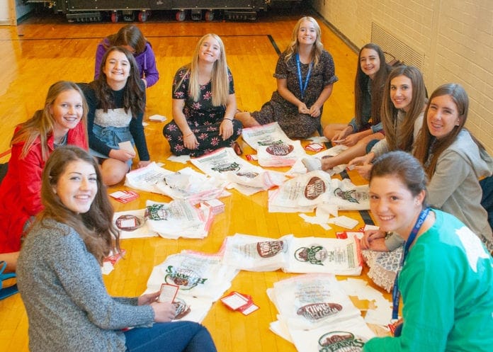 To prepare for the food drive, the Springville High School Key Club, a Kiwanis-sponsored service organization, gathered together about 130 members and other student volunteers on November 8 to label those bags for distribution by local scouting organizations. On Saturday, December 8, those bags will be gathered up and delivered to the Springville Art Museum’s “Art Shop” for sorting into manageable boxes by another army of volunteers. On the following Monday, local leaders pick up the boxes and deliver them to the designated Springville families.