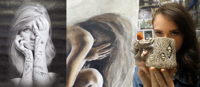 Megan Halley also received the Masters Academy of Art Scholarship. Her piece deals with deep psychological emotion and the scarring of life as a youth in America. Her medium is graphite and her work shows exceptional control and creativity. She said, “I was challenged to say something that may make some people uncomfortable but allows others to know they are not alone in their struggles.”