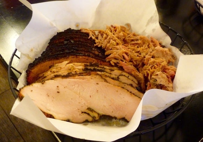 Let’s get right to the meats. When you go to a Smokehouse, you want some good meat. We got a platter with brisket, smoked turkey, and pulled pork. It smelled incredible and you could see the seasonings on the edges of the meat. All of the meats go through quite the process before they hit the table. First, they hand trim the meats. Then the meats are placed in a dry salt brine for 24 hours. Then the meats are injected with some flavor: highlights are Dr. Pepper for brisket, Coca Cola for pulled pork, and butter for the turkey. Then they are smoked. Brisket and pulled pork are smoked for 14 hours.