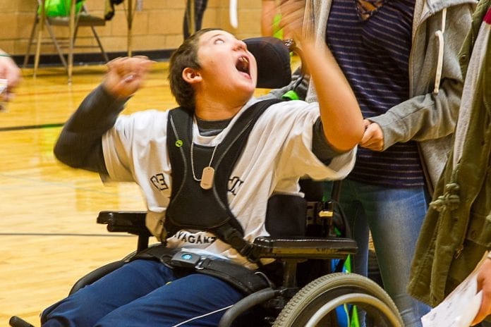 r Ammon Allred, who is confined to a wheelchair, bent over as far as possible and rolled the bowling ball into the pins ahead of him. When he realized he had knocked them down all at once, his face lit up and he expressed his joy with a yell. His coach joined in his happiness, high-fiving him and patting him on the back. Ammon attends Payson Junior High, in Payson, Utah.