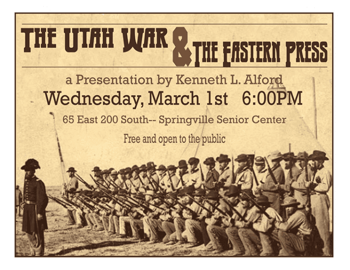 r The Utah War and how residents and members of the press in the eastern United States viewed it will be discussed during a historical lecture, “The Utah War and the Eastern Press,” planned on Wednesday, March 1, at 6 p.m. at the Springville Senior Center, 65 E. 200 South, Springville. The event free of charge and the public is invited to attend.