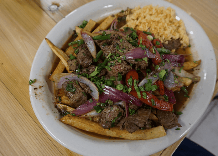 r Lomo Saltado. Translated it means jumping steak. In my opinion, it is the most delicious steak dish I have ever tasted. When they described it to me, they said it was like a stir fry where the oil is very hot and they cook it. I was imagining some kind of stir fry with rice and beans. No, this was more than that. This was tender, juicy, perfectly seasoned steak, onions and tomatoes on a bed of French fries. It is kind of like fajitas but better? I don’t know how to describe it accurately. And it was beautifully presented. I never thought I would say that steak is gorgeous, but this was just beautiful.