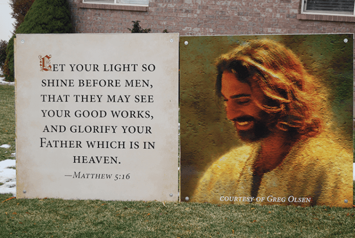 r By Scott BarlowrA Salem neighborhood is trying to keep their reason for the season visible with a unique holiday display. The neighborhood came together to coordinate a display that uses images and scriptures to tell the story of Jesus and Christmas. The display, which is lit from 5:30 to 11:30 p.m., seven days a week until New Year’s Day and is open to the public to walk or drive through. It’s a great experience and will appeal to all ages. Many of the visitors are families, school or youth groups or couples looking for a fun, inexpensive date activity.rThe display, which wraps around the horseshoe-shaped streets of 40 East Maple View Drive, 800 South and 70 West Maple View Drive, combines images with scriptures and quotes to tell the Christmas story. All 26 homes have a display, some of which are pictures from Greg Olson, who gave special permission to use his artwork given the high quality of the displays. The displays are anywhere from 4’ to 8’ making it easy to see from the warmth of your own car.r