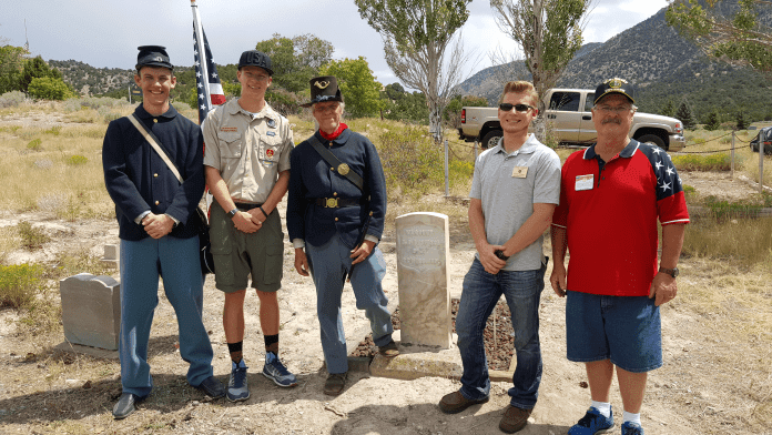 Curtis began cleaning up the grave sites in various sites in the cemetery. Curtis’s neighbor, Robert Pagnani, is active in the Eureka Elks Lodge, and the Elks donated new markers, lava rock, and bricks to outline the individual plots. The work was completed in time for Tintic Silver Jubilee Days August 18 and 19. A ceremony was held at the Eureka Cemetery with Patrick Mahoney dressed in Civil War garb who played songs on an old tin whistle and a fife. Curtis has filed paper work with the VA for two tomb stones, and that request is pending.