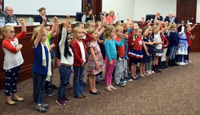 r First-graders at Canyon Elementary school displayed their love for the USA at Nebo School District’s October Board Meeting.