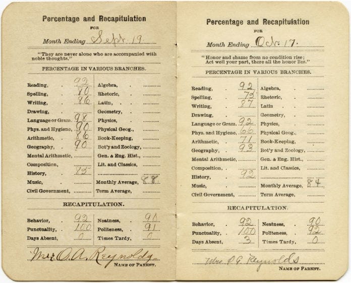 Report cards usually have a parent’s signature, grade and age. It is interesting to note the different types of classes each grade requires. Student newspapers include accomplishments, contests, sports, elections and information on teachers. Annual reports are created by the district superintendents and given to the board of education. Any honors, perfect attendance, lists of graduates, certificates awarded or teacher assignments are reported here.