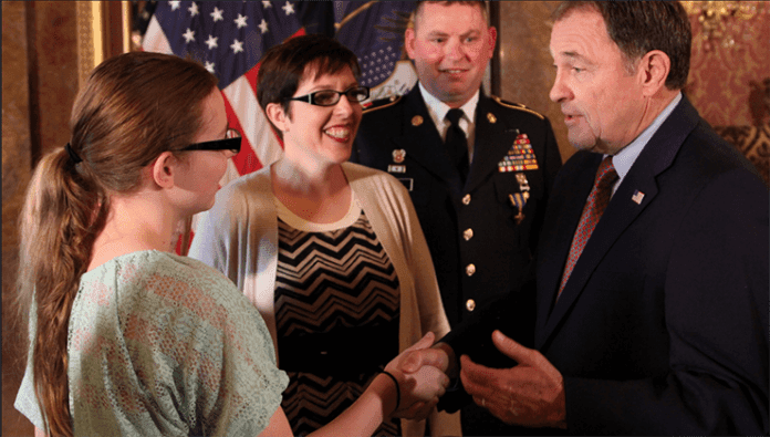 r By Steven FairbournrrUtah’s Gov. Gary Herbert presented the Utah Cross to a Utah Guard member at the state Capitol’s Gold Room in December.