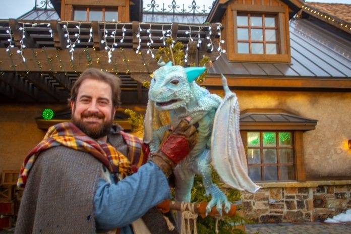 At sunset, the village came aglow with a spectacular array of lights reminiscent of Christmas. The winter village is called Aurora and the King and Queen were beautifully dressed. Their elves were busy moving around and visiting with the village guests. The village had a family feeling and the members of the cast refer to each other as uncle and cousin. It was a cold January night when we visited, and several fire pits were blazing with warmth for rest stops as you wander the village pathways. While pausing at one of the fire pits a young lady showed up with another pet dragon which generated a lot of conversation from the guests. As we were leaving, we met one of the locals with a miniature horse and a little more conversation about this unique horse.