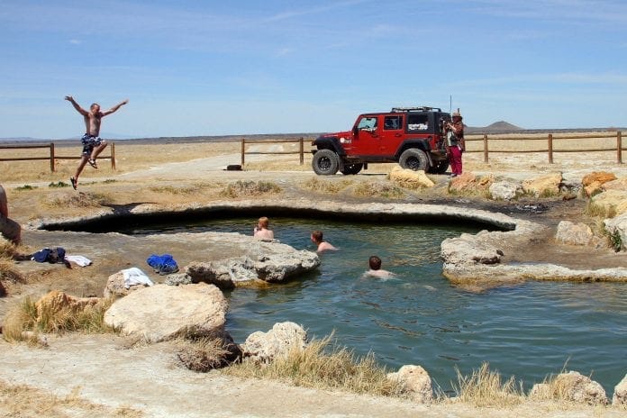 After you leave the lava tubes, you may want to visit the Meadow Hot Spring. As you backtrack back toward Meadow and are near the I-15 underpass on the good gravel road, you will see a good right turn road to the right and southbound. If you come to a place where the road makes a hard right turn and then a hard left turn, you have gone too far. The right turn to the south will take you to a “T” intersection where you again turn right and the Hot Springs are 3.7 miles from that turn-off. The road ends at the parking lot for the hot springs.