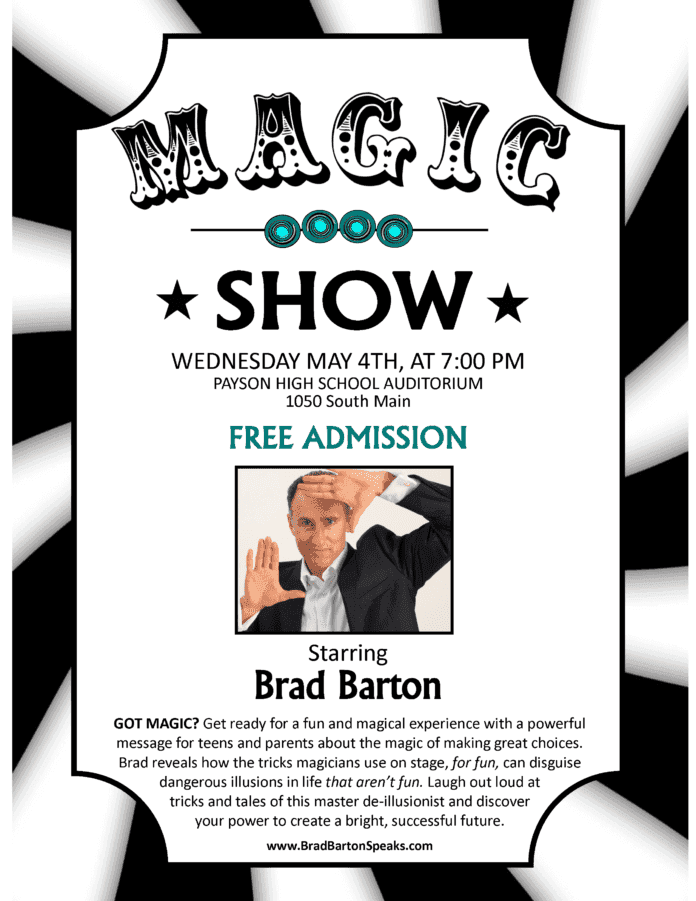 Inspirational speaker Brad Barton will bring his message and his magical illusions to the Payson High School Auditorium on Wednesday, May 4, at 7 p.m. The event is free to the public.