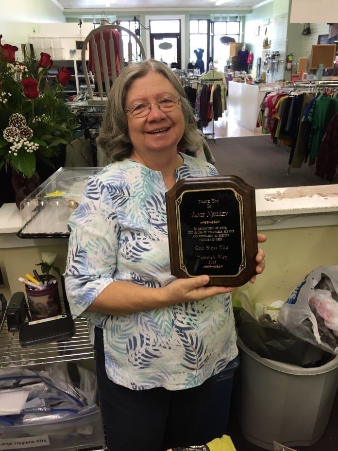 “Janis exemplifies what it means to love thy neighbor. She comes every week for several hours on our busiest day, helping to check and stock food and then serve the food to families. It’s hard work at times, but Janis always serves with a big heart and smiling face,” said Wendy Osborne, director of Tabitha’s Way. “We are blessed to have her as a part of our food pantry.”