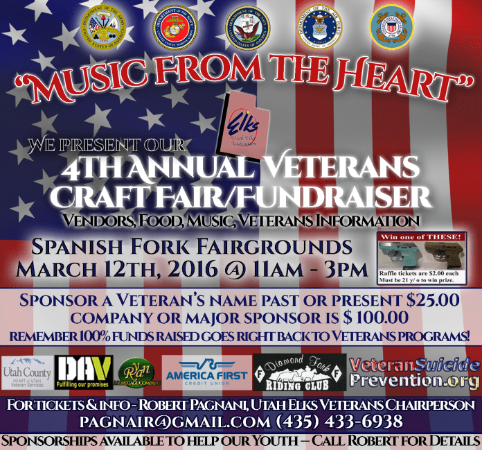 r The Utah Elks 4th annual “Music from the Heart” Veterans helping Veterans fundraiser is Saturday March 12th at the Spanish Fork Arena Ponderosa Building. Remember 100% of the funds raised go to the programs to serve our veterans. From the money raised last year over 800 Veterans and their families were helped!