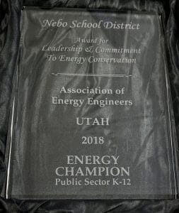 The Association of Energy Engineers awarded Nebo School District, including Energy Specialists Bodie Bradley and Russell Maughan, an Energy Champion award for their commitment to energy efficiency through equipment, lighting, and controls upgrades.