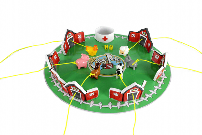 The board game, based off an old farmer’s game, is centered around rolling a pair of dice in order to capture the other players’ farm animals. The fast-paced game features six animals tied to individual tethers, and when “Farmer Corky” rolls either a 7 or 11 on the dice the other players yank their animals back before the farmer catches them in a cowboy hat. The game is won when a player has collected one of every other player’s animals.