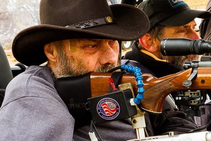 One of the Chairbound members is Andy Dahmen who has a special gun mount for his side by side ATV that enables a handicapped person to aim a rifle with shoulder movement. A powered trigger mechanism made by Be Adaptive Equipment of Columbia City, Indiana, was loaned by Todd Branin of Richfield, Utah. This device has three components: the electric activator mounts inside the standard trigger guard, the control box that attaches to the stock of the gun by a Velcro strap, and a suction tube that extends from the control box. The user sucks on the tube to pull the trigger. With this setup, a target practice day was scheduled for Saturday, December 9, to put Frank behind a gun sight for the first time in a long time. The practice gave him confidence with the equipment and his shooting accuracy was pretty amazing. His first three shots were in the center box of the target sheet.