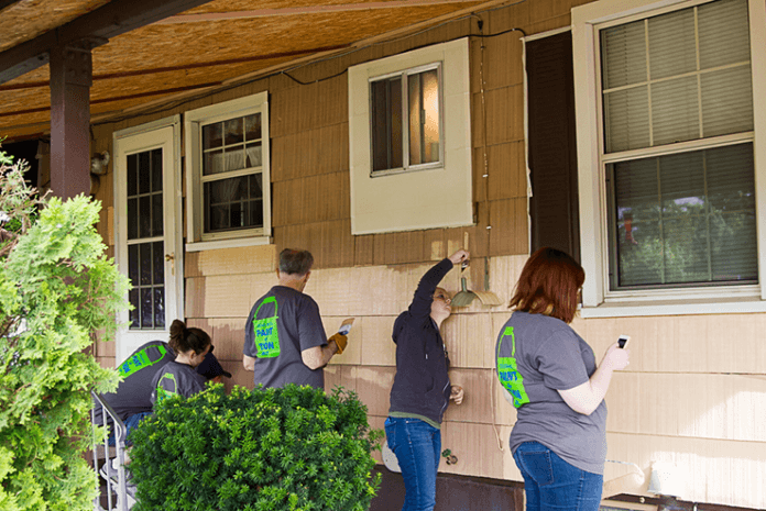 This old house is occupied by an 85-year-old widow with limited mobility, and it was nominated for a paint project by John Wallace of Neighbor Works, who delivers her Meals on Wheels. The project was carried out by a team from Zions Bank, and the recipient was so excited to have her house painted.