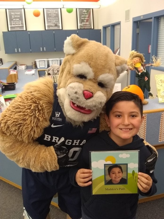 On November 20, 2018, My Story Matters partnered with BYU’s “Cosmo’s Dunk Team” to promote education and celebrate story at Spring Creek Elementary. After a fantastic assembly focused on the value of learning from mistakes, working together, and never giving up, we presented the children with their books. One of the children who received their books was Maddox, an energetic 6th grader with a bright future.
