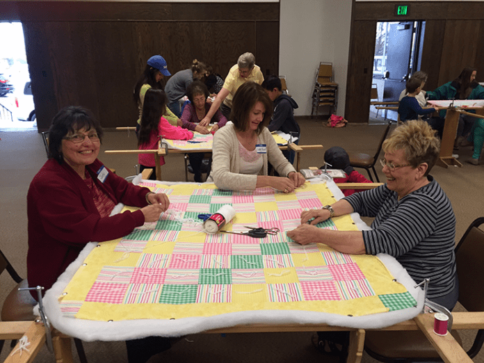 People of all ages and skill levels helped create the blankets, which will be distributed to individual homes in 2017 by nurses and staff at the county’s Maternal and Child Health office. While some gathered previously in homes and churches to make tied baby quilts and sensory “tag” blankets for the project, most came to the building to organize donations and supplies, cut and measure fabrics, stitch flannel receiving blankets and tie dozens of tummy-time quilts. Enthusiasm was high and many hoped to repeat the project in the future.
