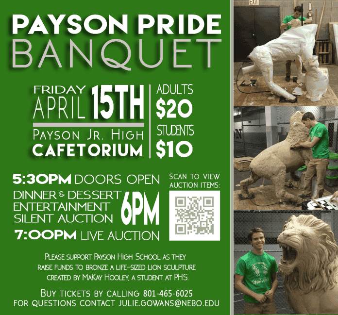 r On Friday, April 15, Payson High School will be holding a Payson Pride Banquet. The banquet will be held at Payson Junior High School in the cafetorium. Doors will open at 5:30 p.m. A turkey dinner will be served between 6:00 and 7:00 p.m. This will include dessert provided by Eli’s. During which entertainment, and a silent auction will take place. A live auction will follow the dinner hour and will go from 7:00 to 8:00 p.m. The auctions will include hand crafted furniture, shooting lessons, golf packages, prom packages, massages, and much more. All items are donated by local businesses and members of the community. Entertainment will be provided by the high schools different performance clubs and teams. Tickets are $20 dollars for adults and $10 dollars for students.