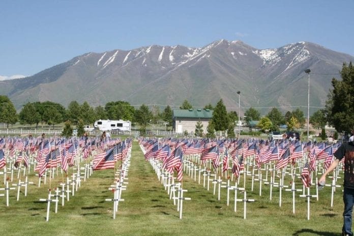 r On May 26, I watched American citizens of all ages line up in the Spanish Fork Cemetery to have small white crosses made of metal passed into their arms.rThe day was already beautiful, but the sound of a teenager’s voice asking for “just another handful; it’s not too heavy. Please.” In that voice of politely asking was more beauty than seen in the snow-capped peaks wrapping round the scene and towering just to the east.rArms young, old, black, white and brown took four, 10, 20 and some even more of the crosses into their arms. And with each taking, the field of white rows, topped with Betsy Ross’ pride, snapped to attention in the unseen – but always felt – Spanish Fork Bench legendary wind, and the taking saw the field grow bigger. And despite the beauty and the camaraderie, inside you were screaming for that growth of beauty to stop.