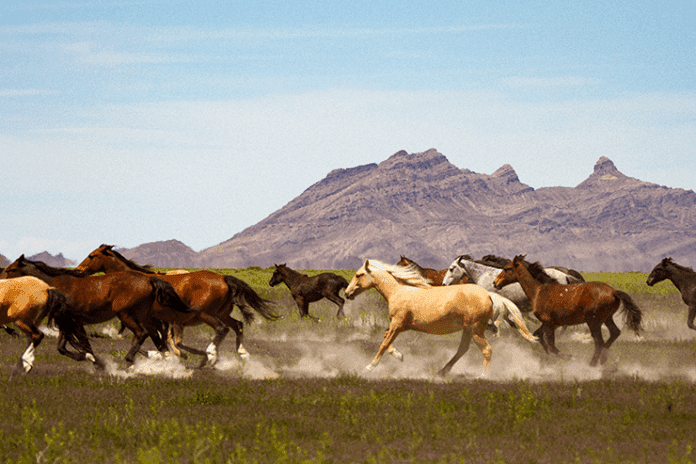 These horses are descendants of horses brought west by the early pioneers and the U.S. Cavalry. In Utah raising horses to sell to the U.S. Cavalry was big business for the ranchers. These once domesticated horses escaped from captivity or were abandoned, and that is why we see brown, black, buckskin, palomino and pinto horses.