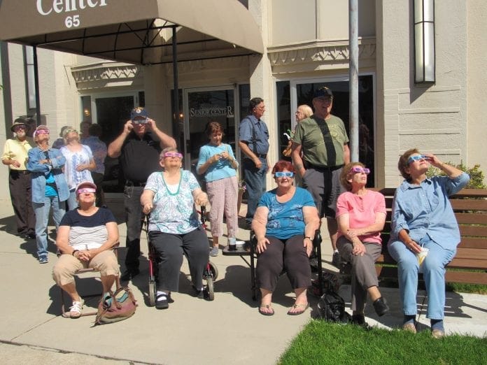 Over forty members of the Springville Senior Center gathered outside Monday, August 21, to watch the solar eclipse. Wearing protective eye-gear, they excitedly chatted with each other about the changes they were observing. The eclipse party started at eleven with gift bags handed out that included solar glasses, a milky way candy bar, some star burst candies, and other goodies.