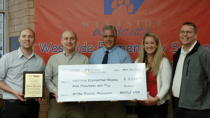 r This year Westside Elementary, in Springville, celebrates a 15 year Adopt-a-School partnership with Nestle. Westside is so grateful to Nestle for this partnership and their great generosity, and also to Jason Osborne, the Nestle employee who has coordinated all of their efforts. Through this incredible program Westside has received school supplies and several fiscal donations which have been and will continue to be used to perpetuate after school programs and tutoring for students. In addition, Nestle partnered with Westside this year to run an after school fitness challenge promoting healthy lifestyles.