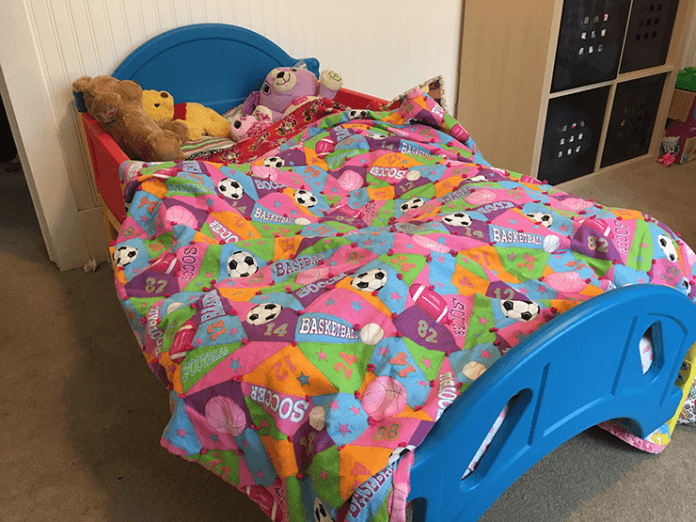 The first step in going to bed for the kids is putting on their pajamas. Once they get over the initial shock of bedtime, it’s not much of a fight to get them to put on pajamas. (Why no fight? My theory is that everyone likes to put on comfy clothes, and what’s more comfy than pajamas?)