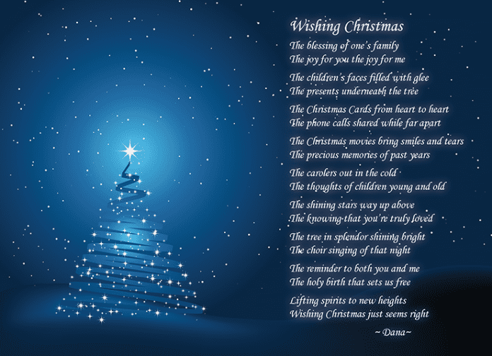 r Wishing Christmas The blessing of one’s family The joy for you the joy for me The children’s faces filled with glee The presents underneath the tree The Christmas Cards from heart to heart The phone calls shared while far apart The Christmas movies bring smiles and tears The precious memories of past years The carolers out in the cold The thoughts of children young and old The shining stars way up above The knowing that you’re truly loved The tree in splendor shining bright The choir singing of that night The reminder to both you and me The holy birth that sets us free Lifting spirits to new heights Wishing Christmas just seems right. ~ Dana~