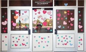 On Monday morning, Springville High students were greeted with paper hearts containing positive messages about the school placed early in the morning by Maple Mountain High School students.