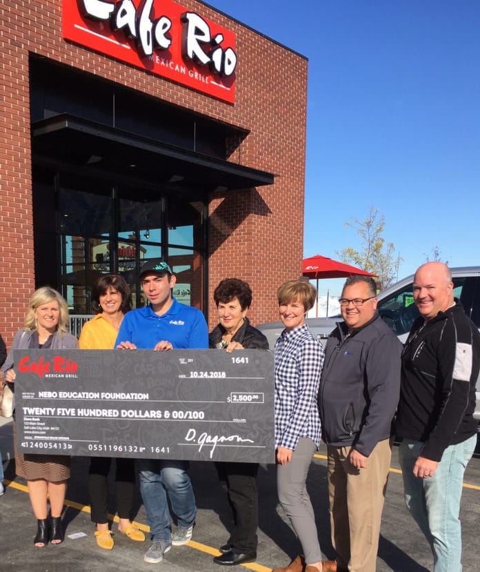 r Cafe Rio in Springville opened its doors on Wednesday, October 24. Cafe Rio’s spokesperson stated that they always like to give back to the community and one way is to donate to the schools. Nebo Education Foundation received a $2,500 check from Cafe Rio and will disburse it to schools and teachers through grants.