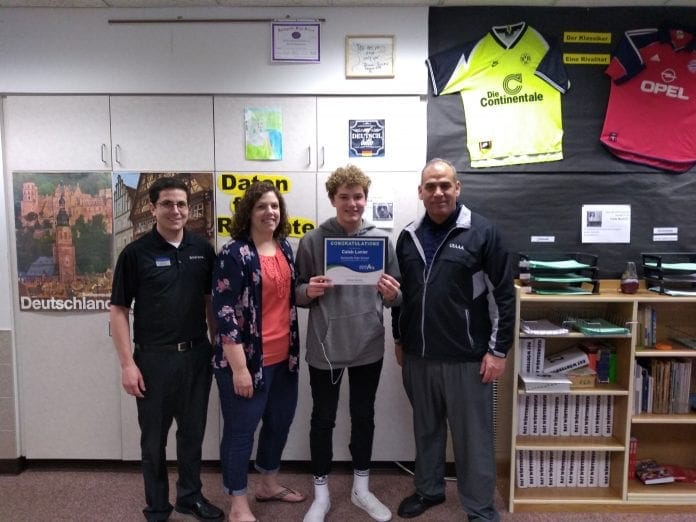 Pays for A’s rewards students who put in the effort to make their grades count. Chad Bishoff, manager of the Zions Bank Springville branch, surprised Lanier with his win during an assembly on March 8.