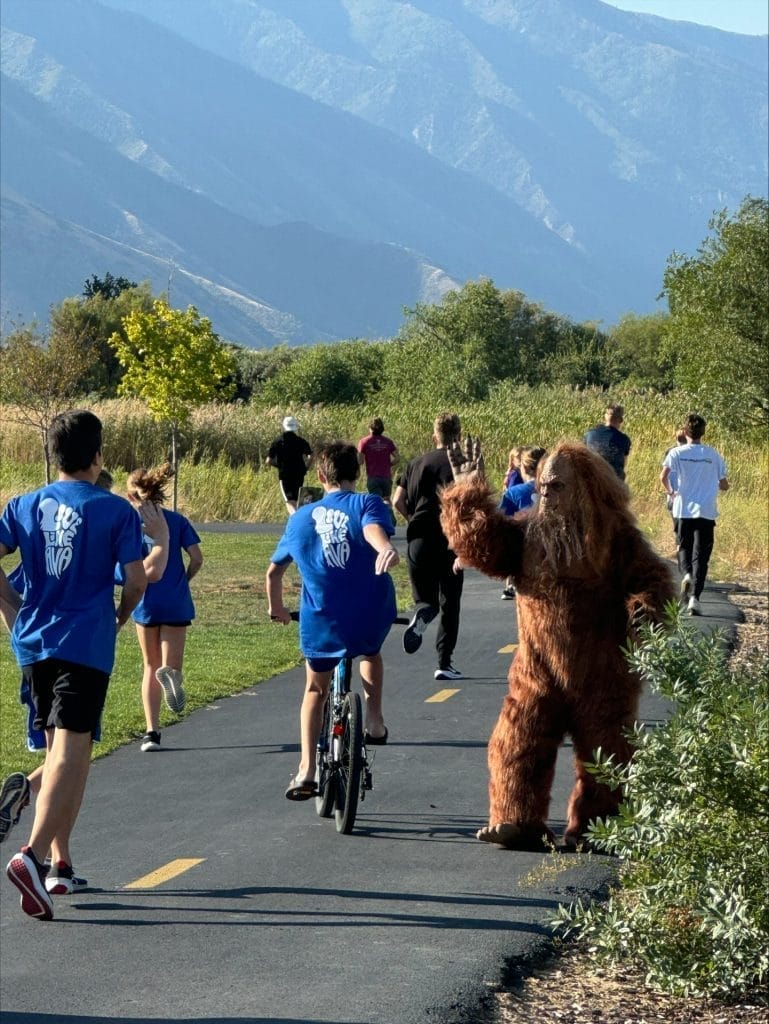 During the fun run, a friend in the neighborhood dresses up in a bigfoot costume and interacts with the children, taking pictures with participants.