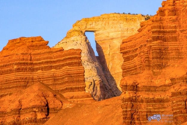 It is not unusual to see wild horses near the north end of the canyon. Unique Hondu Arch is a dominant feature at the end of the road. The Hondu country receives its name from the resemblance of Hondu Arch to the small loop knot at the end of a cowboy’s lariat (the Spanish spelling is Hondoo, the USGS topographical maps spell it Hondu). The area was first discovered by Ole Sorensen of the town of Emery, who started running cattle in the area in 1877.