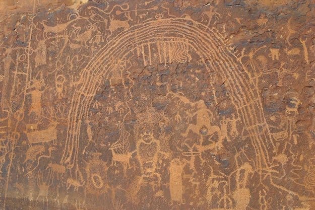 The collection of images chipped into the rock wall appear to represent multiple generations of activity. This location may have been an ancient meeting site. There are petroglyphs of more recent origin that include depiction of horses.