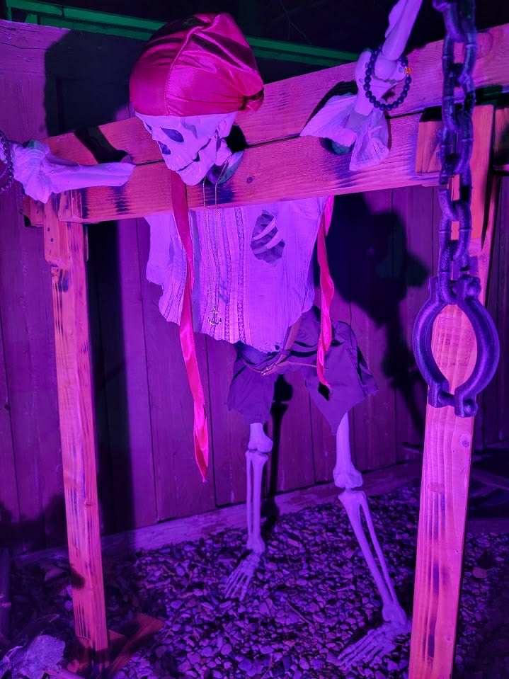 “I’ve always been really interested in props and special effects and pirates,” he said. “And I always wanted to be a special effects artist. When my wife and I were married and had our first house, I really did up the front yard and sound and lighting and everything, and it scared the kids away to the point where my wife’s like, ‘yeah, we’re not doing that anymore.’ So we kind of toned it down a little bit. Our very first full-size prop was a pirate skeleton, which we still use today.”