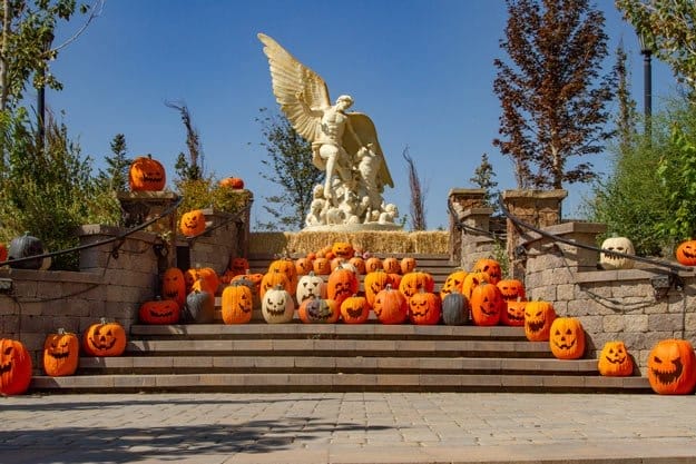 Along one walkway is a large figure made of Jack-o-Lanterns. A spectacular sight when visiting Evermore is always the statue of the Archangel Michael and during October the steps up to the statue are lined with Jack-o-Lanterns.
