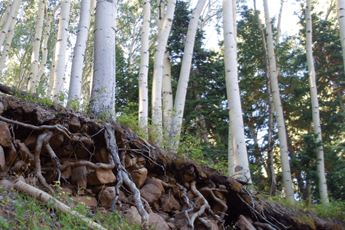 Aspen trees grow in clusters from a common root system, establishing a family of trees. You notice this in the fall when the leaves turn to a golden yellow color all at the same time within a family root system. Nearby trees of a different root system may not have not have changed color yet, A new tree sprouts from the root and grow to the surface when the root system recognizes when there is good conditions to start a new tree. Amazing creation of God.