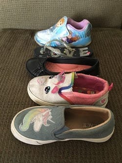 There was one Sunday shoe, one tennis shoe, one sandal, and two different slip-on shoes. (Both of the slip-on shoes had unicorns on them, but they still weren’t a matching pair of shoes!)