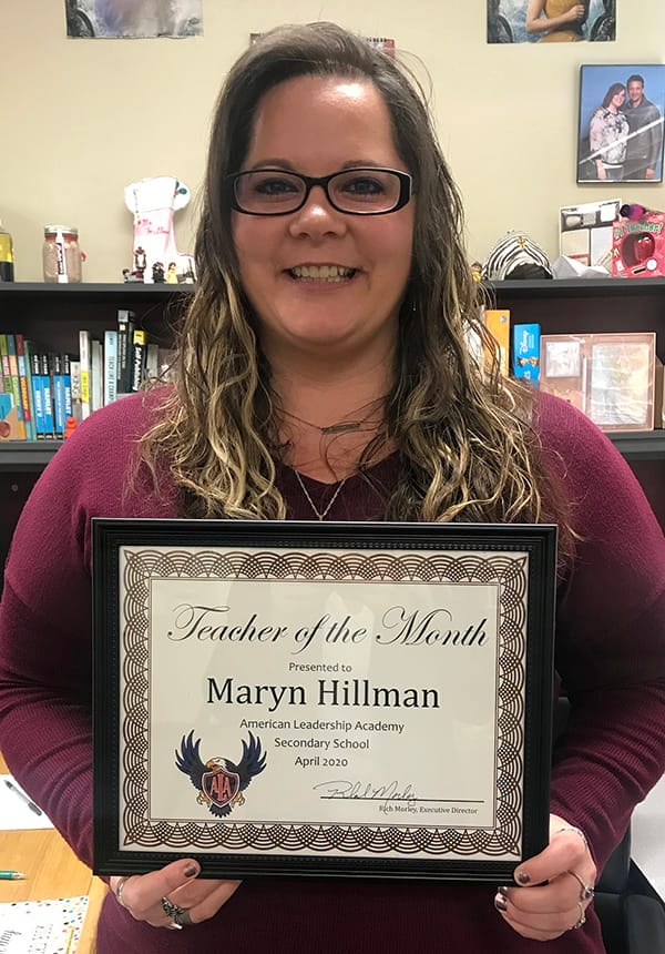 Maryn Hillman was recognized as the April Teacher of the Month for American Leadership Academy.