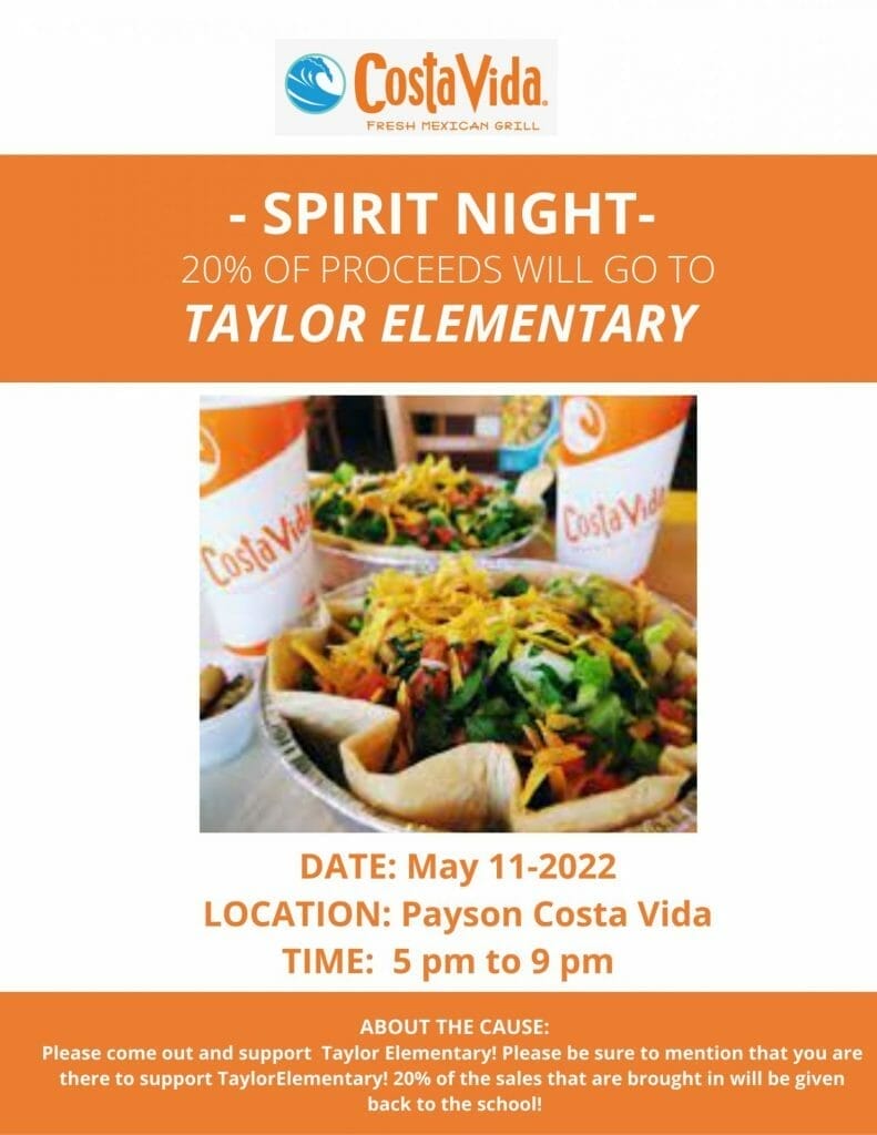 We are Costa Vida, we would like to support our community by helping our local high school and elementary school. We want to enrich the lives of students in our community. We invite you to have a fresh coastal Mexican grill at Costa Vida in Payson and be a part of our cause: where 20% of proceeds will go support Taylor Elementary. Payson, show your love on Spirit Night and dine with us!