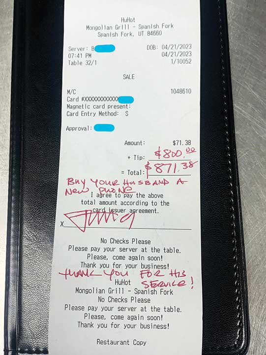 On April 21, a waitress at HutHot Mongolian Grill in Spanish Fork was asked a question that would change her immediate life drastically.