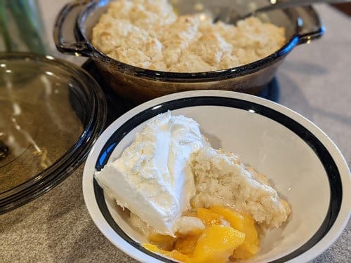 Canned Peach Cobbler (because, let’s be real, the fresh peaches in the store aren’t that great right now).