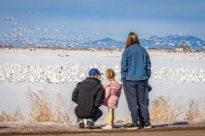 Excitement and awe fill the air as a flock of Snow Geese rise up from feeding grounds and head to the Gunnison Bend Reservoir in Delta, Utah. If you’ve ever been near a flock of several thousand birds, it is a dizzying sight. Before taking off, and while in flight, they are communicating with each other. A wave of honks increases in sequence and pitch, and a honking frenzy precedes the immense whooshing, and slapping of wings as they take to the air.