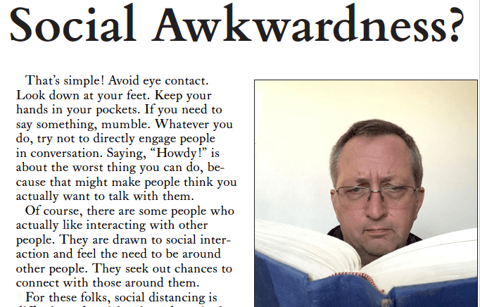 Social distancing shouldn’t be that hard for me. Why? Because there’s not much difference between social distancing and being socially awkward, and I’ve been practicing social awkwardness for many, many years!