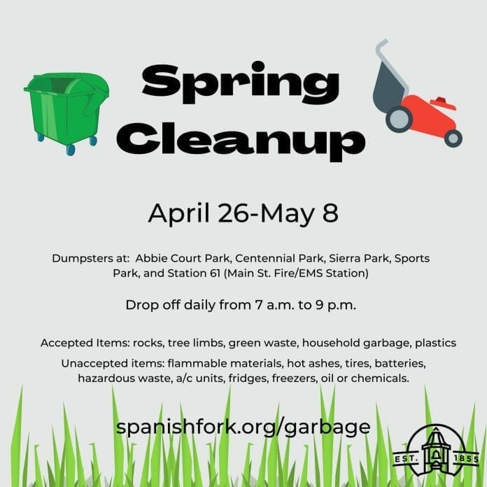 Spanish Fork City’s Spring Cleanup event will be held from April 26-May 8. Take advantage of the chance to dispose of green waste and household garbage without a trip to the transfer station. Dumpsters will be placed in five different locations throughout the City:
